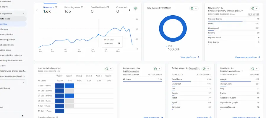Track your visitors’ behavior in real time: page views, traffic sources, conversions, devices, and user journeys.